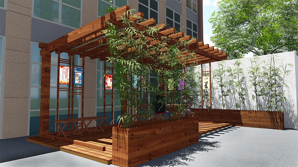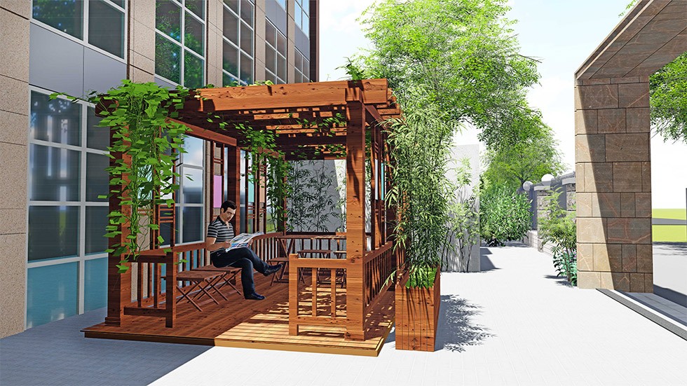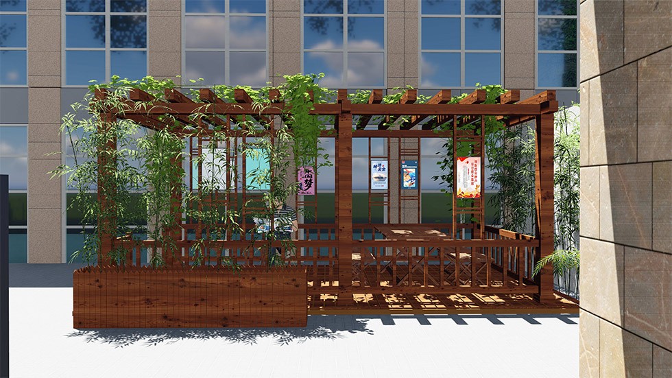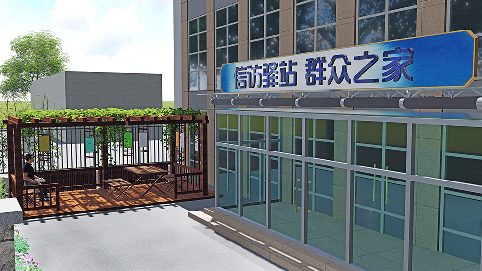 本次设计以提升区政府院内空间利用率为目标,通过增设带休息座椅的木廊架,为工作人员和访客提供了舒适的休憩场所。廊架内格栅嵌入宣传画面,兼具美观性与功能性,可用于展示文化或政策信息。局部增加的小花箱和植物装饰,丰富了景观层次,营造了自然氛围。新建的入口大门则提升了院区的整体形象与仪式感。设计注重实用性与美观性结合,既优化了空间功能,又提升了环境品质,打造了一个兼具休闲与文化展示功能的景观节点