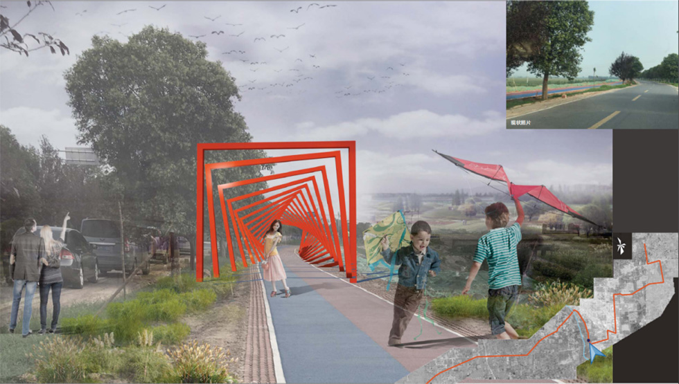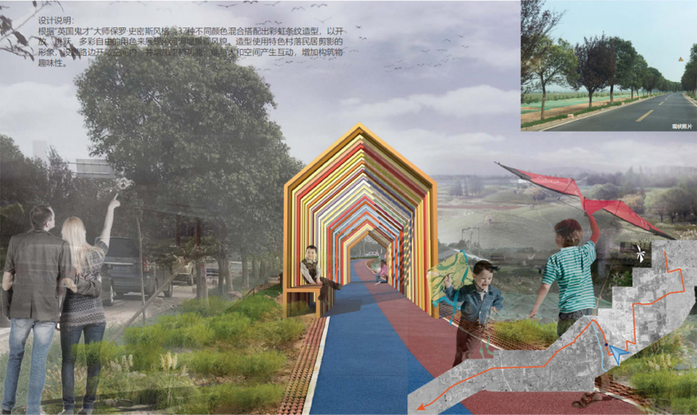 本项目以“活力乡村·诗意栖居”为主题,通过沿村路打造连续性景观空间,串联多个功能节点,提升乡村环境品质与村民生活体验。设计亮点包括沿主路设置特色小品、艺术构筑物及休憩空间,形成视觉焦点与文化标识,同时贯穿全村的彩色跑步道提供健身与漫步功能,增强道路活力。此外,每户宅前空间优化增设廊架、座椅及健身设施,促进邻里互动,满足日常休闲需求。整体设计融合实用性与乡土美学,通过微改造激活乡村公共空间,营造宜居、宜游的美丽乡村新风貌。