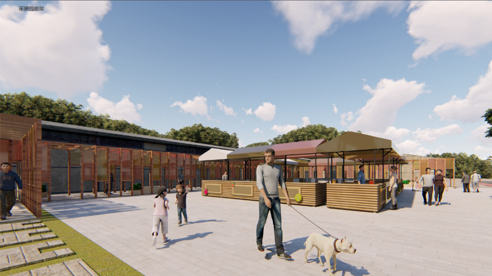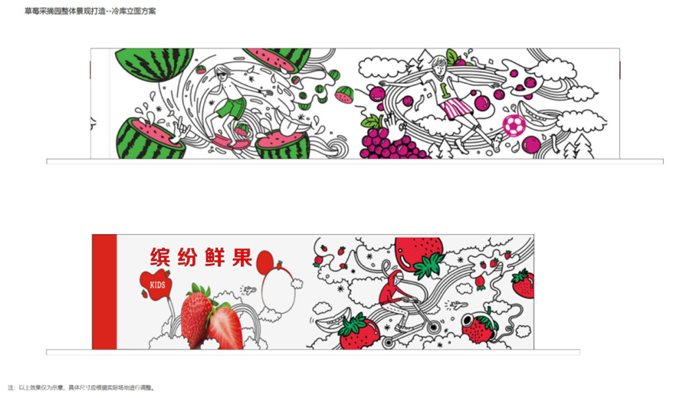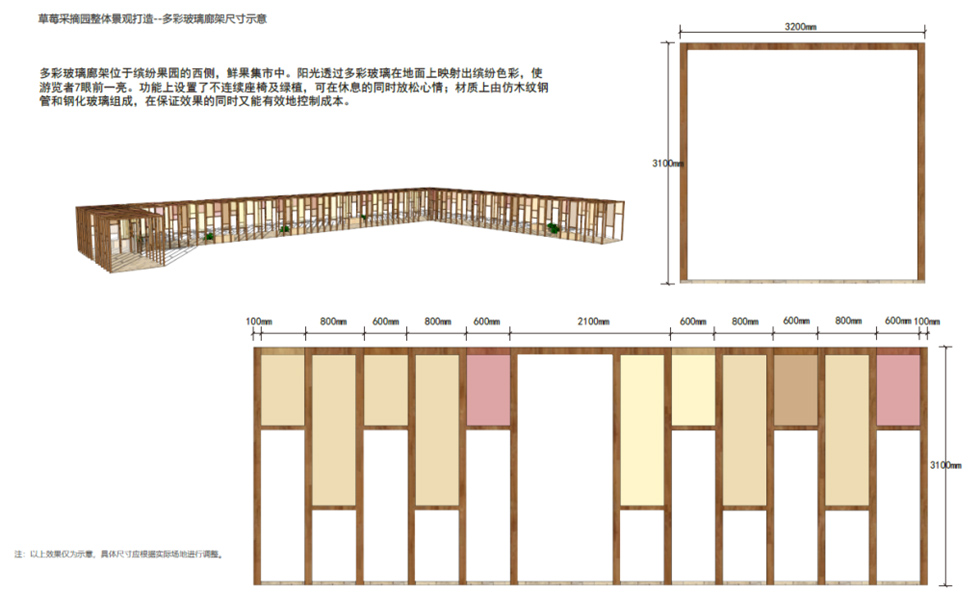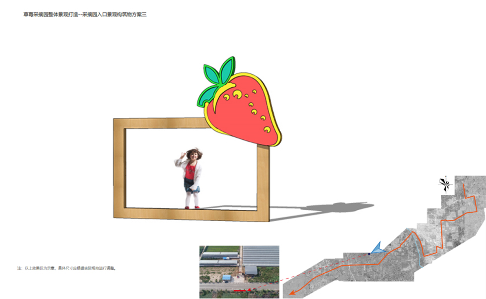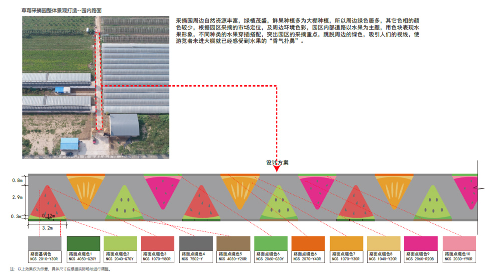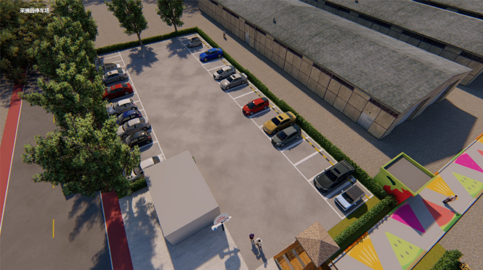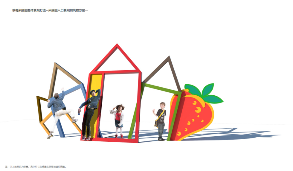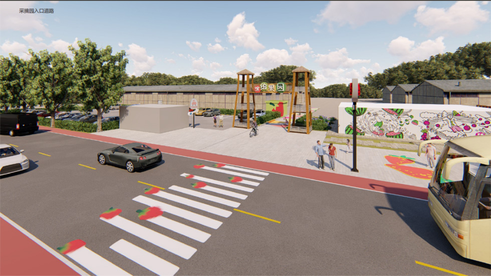 乡村采摘园改造以“缤纷农趣·活力田园”为主题,通过色彩与功能的融合打造沉浸式采摘体验。新建的木架结构大门搭配彩色LOGO字形成鲜明入口标识,道路采用彩色涂刷增强视觉引导性,沿街增设绿化种植与景观小品丰富空间层次。园内核心区域设计长条形彩色格栅廊架,提供休憩与拍照打卡功能;建筑墙面通过主题彩绘增添艺术氛围,展现农耕文化特色。同时,院内灵活布置移动售卖亭,方便农产品展示与销售。整体改造在保留乡土气息的基础上,融入现代设计手法,营造出兼具实用性与网红特质的休闲农业空间。