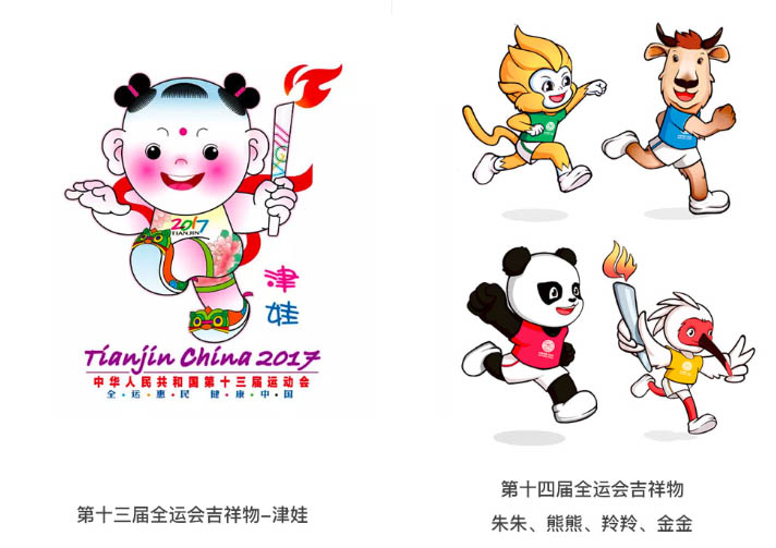 朱鹮“朱朱”,手举火炬,展翅飞跑;大熊猫“熊熊”,张开双臂,热情奔放;羚牛“羚羚”,健壮憨萌,阔步向前;金丝猴“金金”,聪明智慧、灵动可爱。身着“富裕黄”、“圣地红”、“梦想蓝”、“生态绿”运动装的吉祥物组合,分别寓意奔向新时代、喜迎八方客、同享新生活、共筑中国梦。